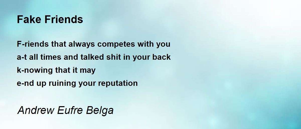 24/01/2018?? Fake To Take is a short poem about fake friends by English poet, Ms Moem. Published by, Ms Moem, Ms Moem is an English poet. Since 2007, she has taken thousands of ?