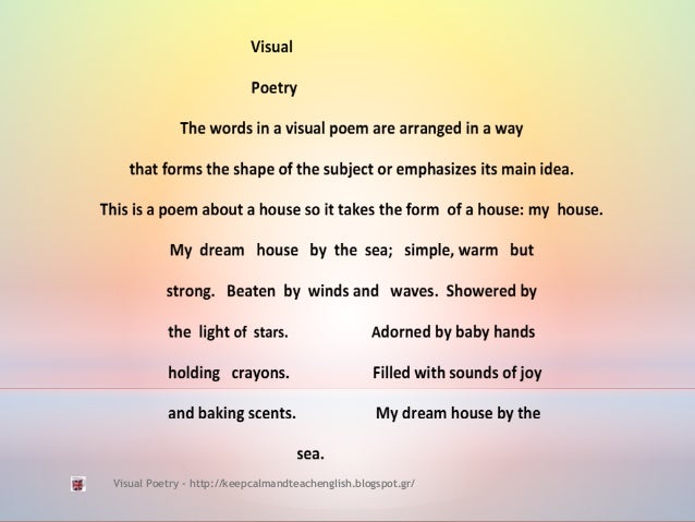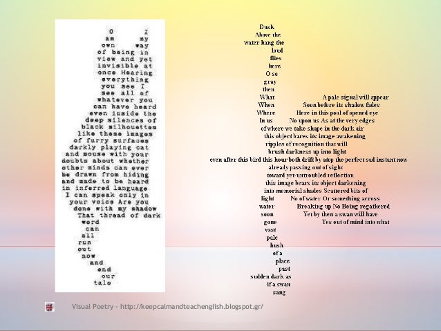02/03/2022?? Types and examples of visual poetry letters and drawings. In this example of visual poetry, the images are as important as the words of the poem and are... typographic ?