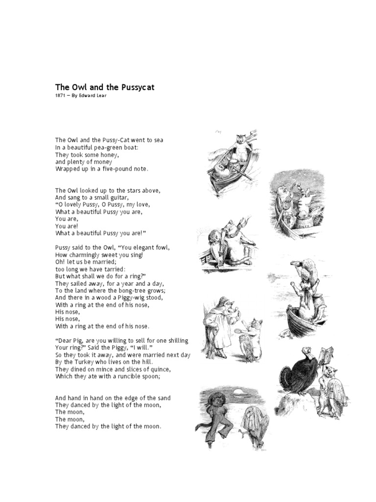 By Edward Lear, I, The Owl and the Pussy-cat went to sea, In a beautiful pea-green boat, They took some honey, and plenty of money, Wrapped up in a five-pound note. The Owl ?