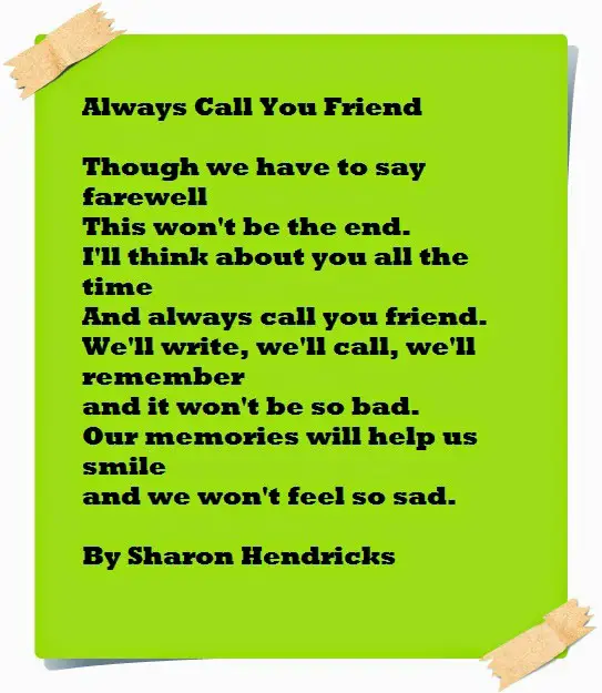 14/09/2022?? These heart-warming goodbye poems for friends will let you know that friends can be friends, irrespective of the distance. 1. Dear Friend, Dear friend, ?tis hard to say farewell, And harder yet it is to tell, In parting words, how strong the tie, We sever now in this good-bye. ?