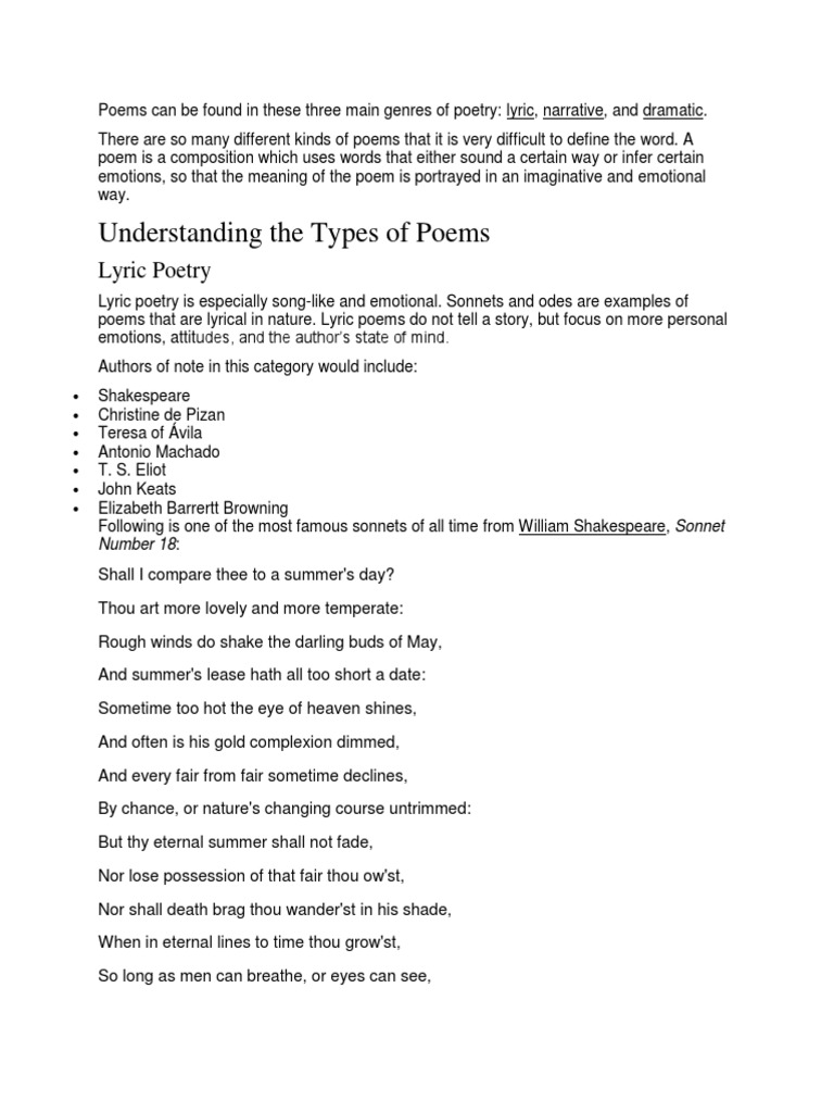 A poem is a composition that uses words to evoke emotions in an imaginative way. Although poetry is a form of self-expression that knows no bounds, it can be safely divided into three ?